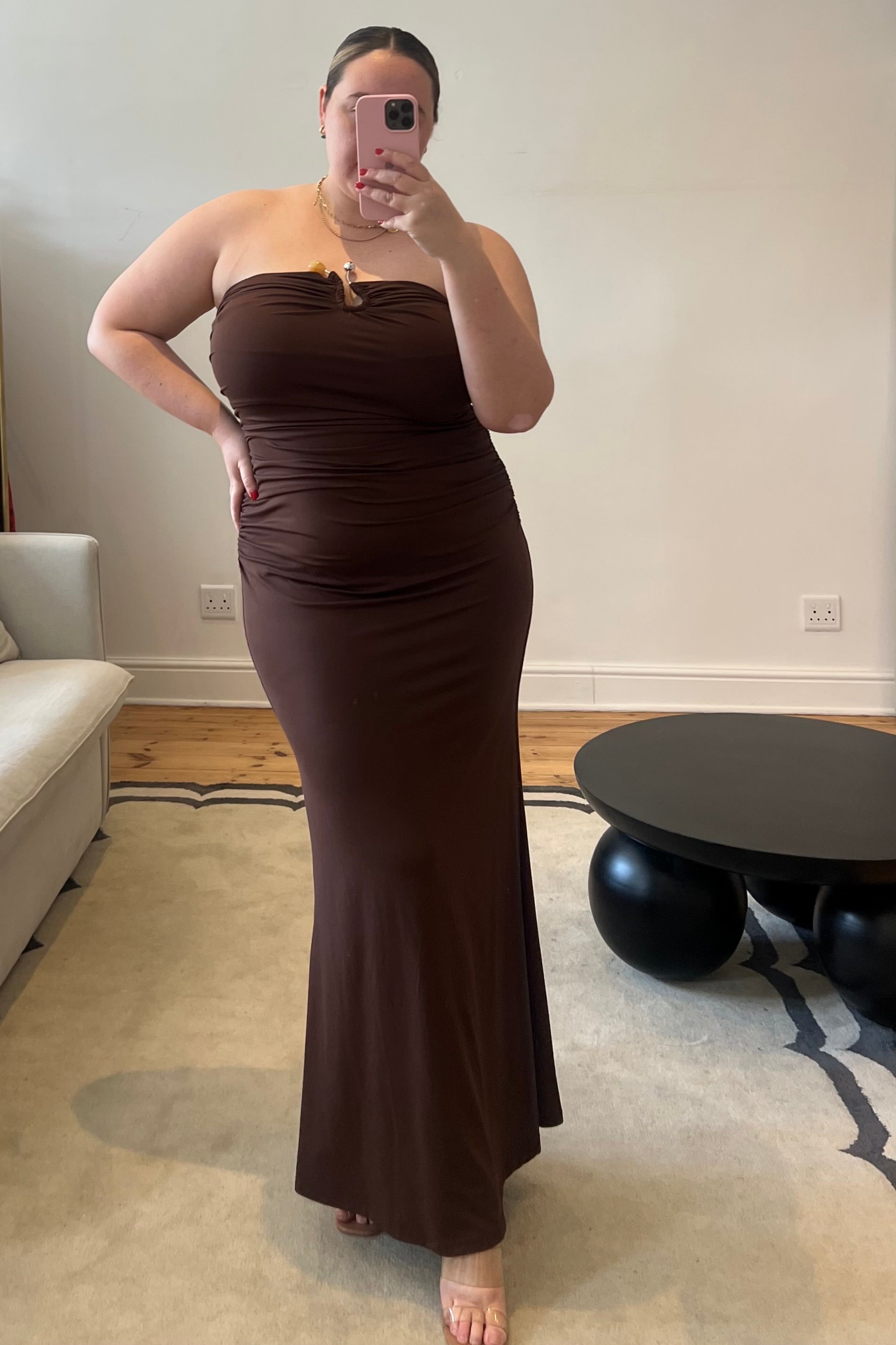 - Strapless chocolate brown design for effortless elegance