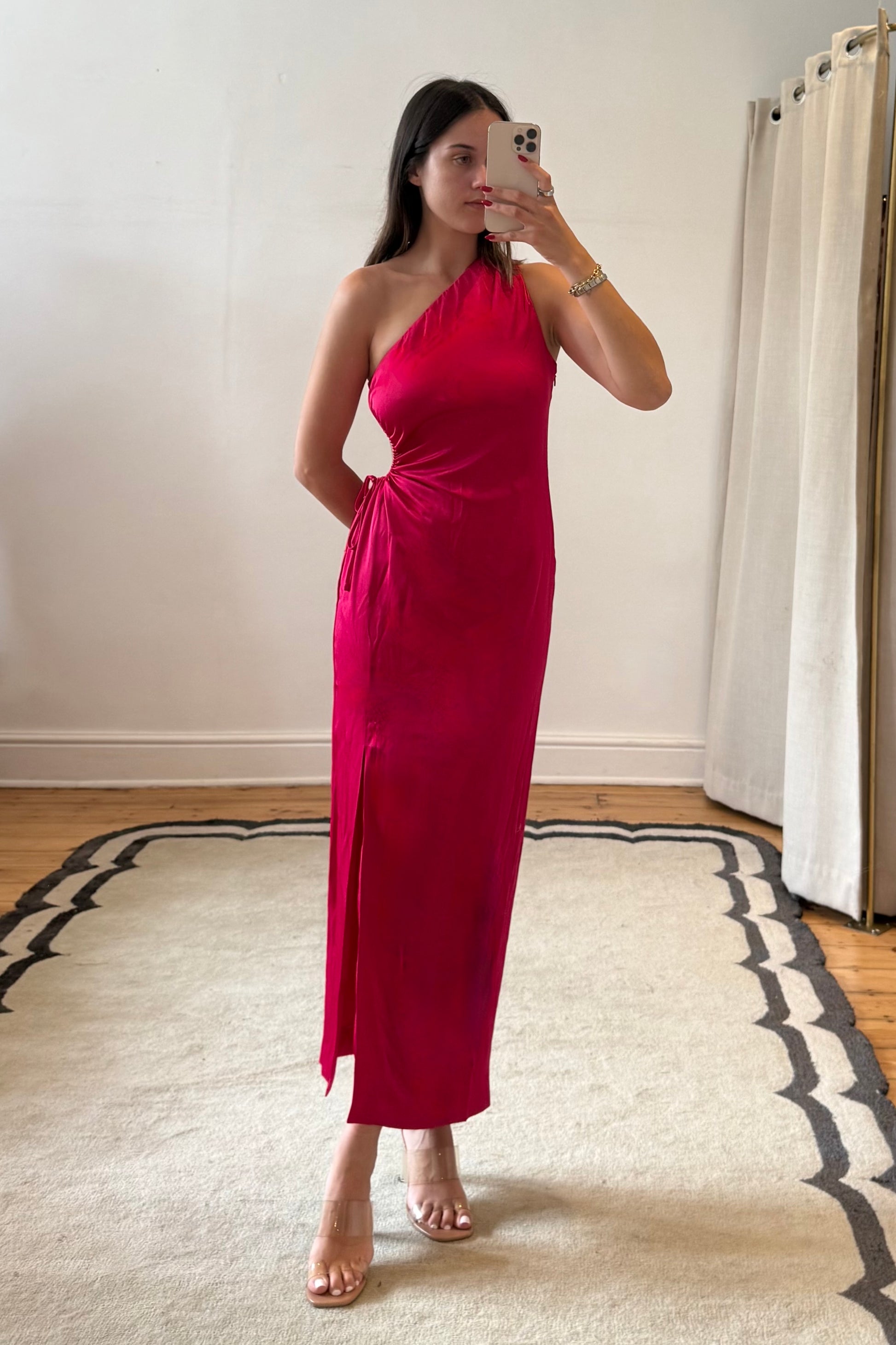Available in sizes 36 and 40. Designed for a fitted, flattering silhouette that highlights the waist and drapes smoothly over the body. Ideal for those looking for a chic, statement midi dress with a refined finish. Due to the drawstring on the side, you are able to size down so would fit a size 6 as well as a 10.