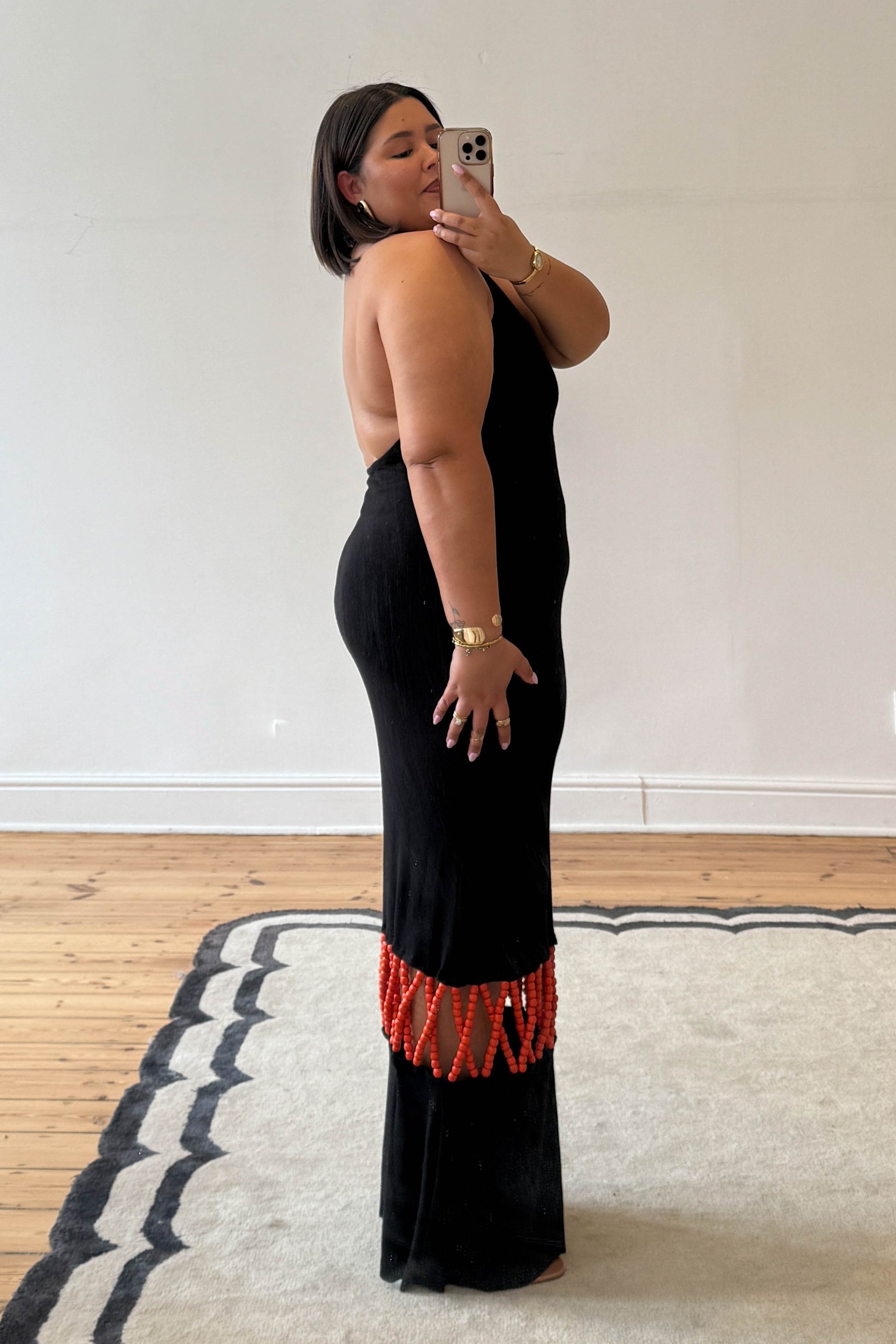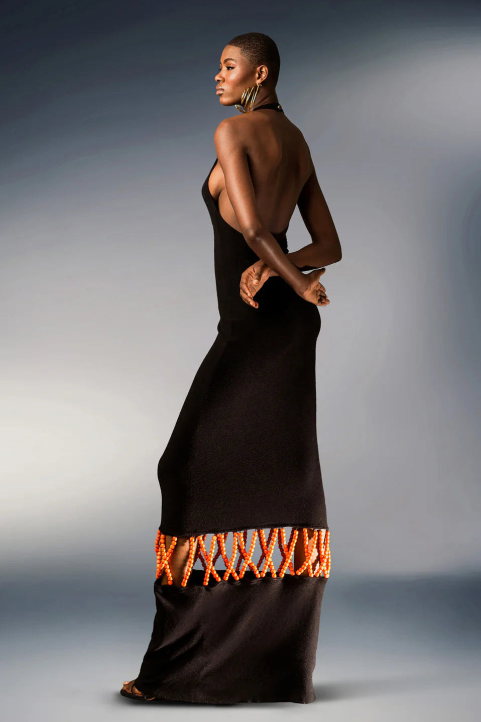 - Hand-beaded embellishments at the hem inspired by traditional Edo coral beads