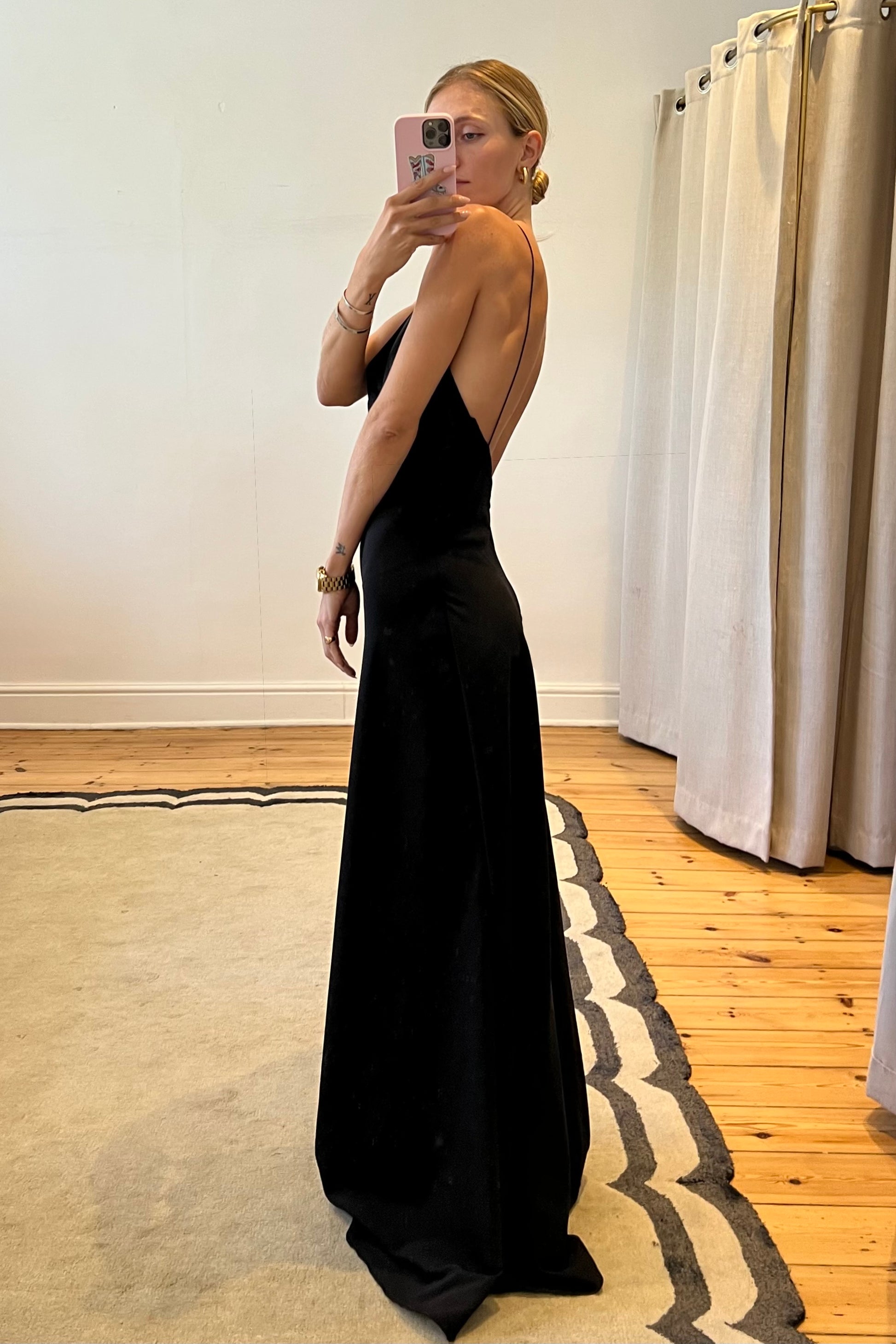 Available in size 8 this full-length black gown is designed to flatter with a streamlined silhouette that elongates the figure. The tailored fit accentuates the waist while the floor-length design creates a statuesque, elegant look. Crafted from luxurious fabric, it drapes beautifully for a sophisticated, polished finish.