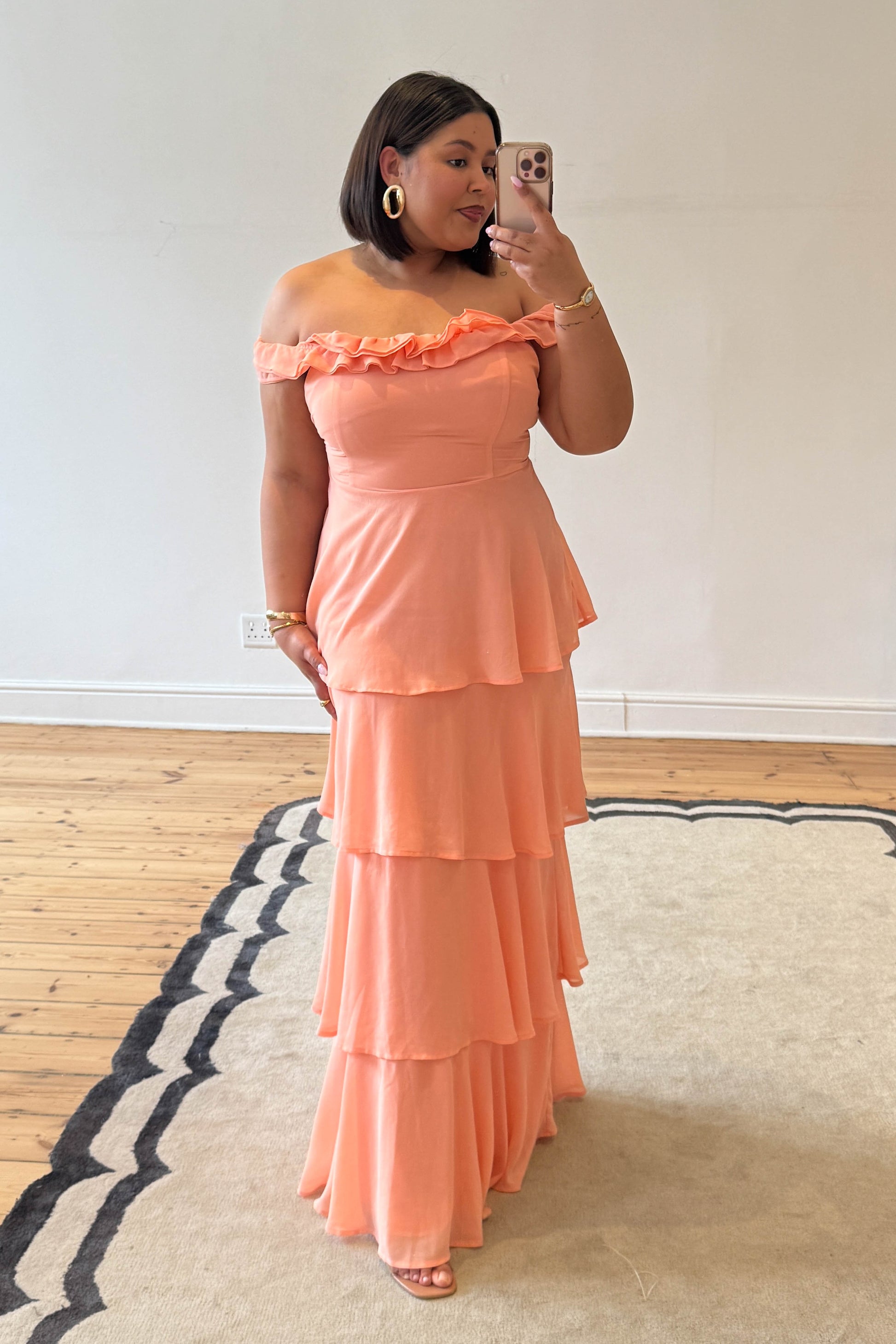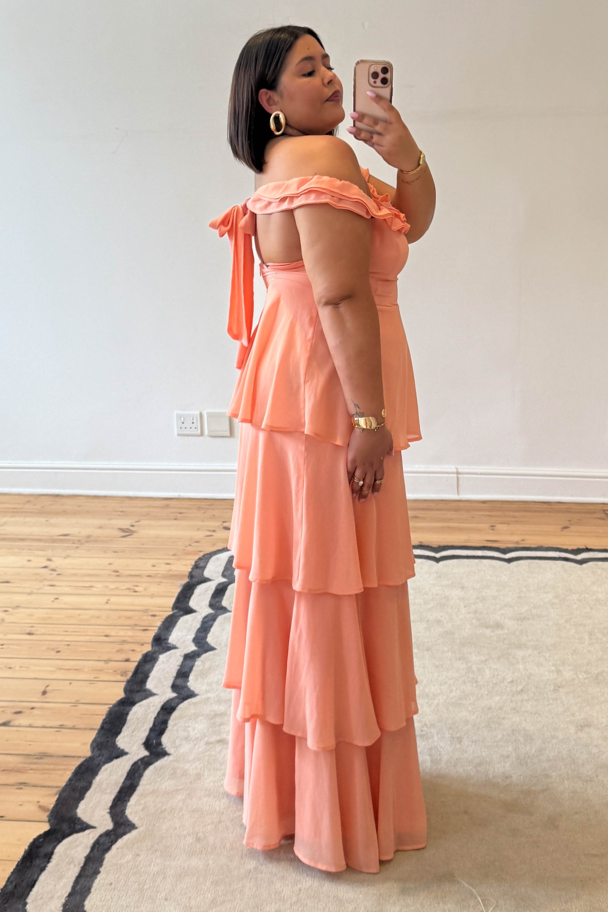 Effortlessly graceful, The Leighton Dress by Lulus is a romantic tiered maxi gown designed for unforgettable moments. Crafted from lightweight chiffon, it features an off-shoulder neckline, seamed bodice, and flowing A-line skirt that moves beautifully with every step. An open-back detail and hidden back zipper add a modern touch to this timeless silhouette.