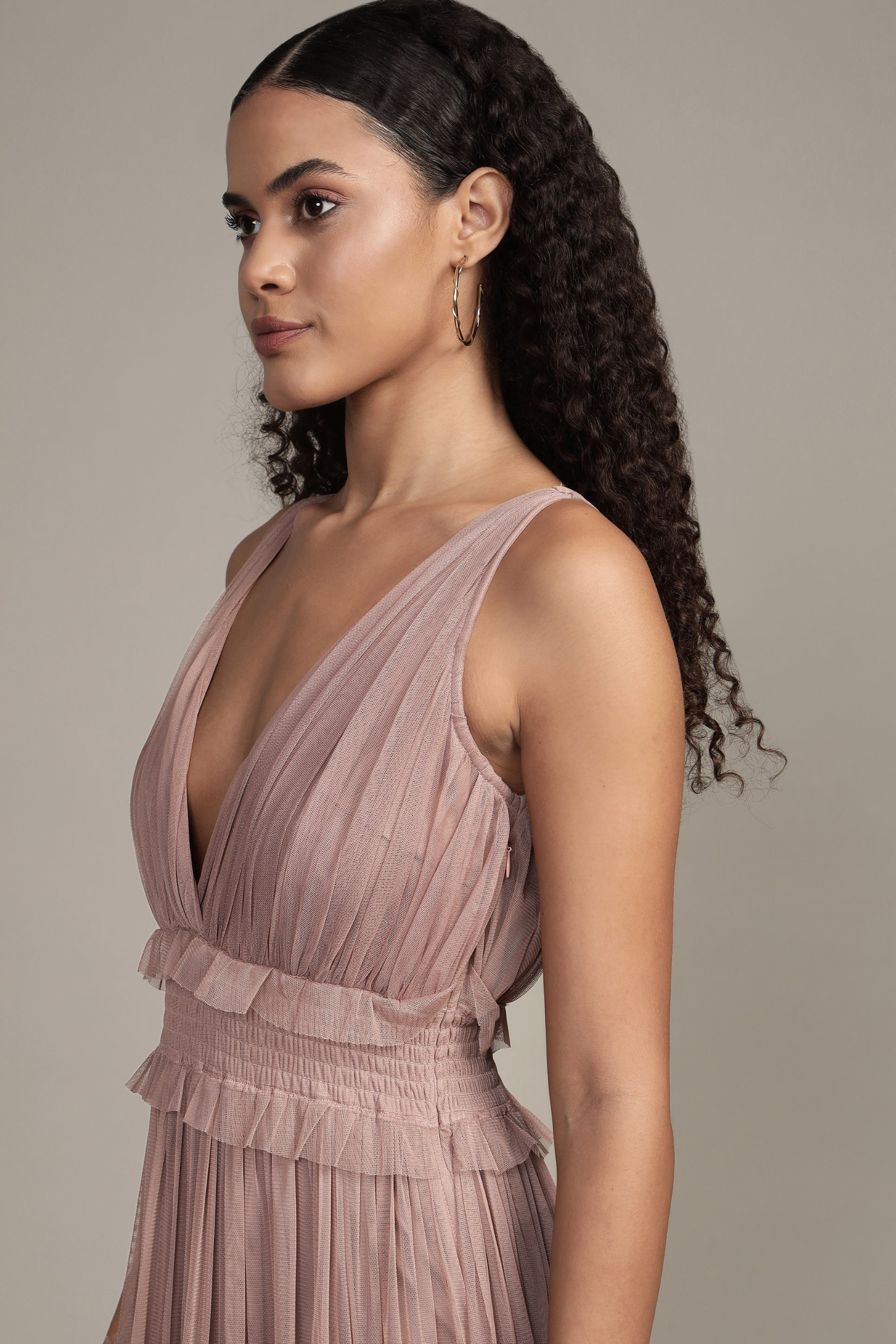 • Plunging neckline paired with layered tulle skirt for movement and fluidity