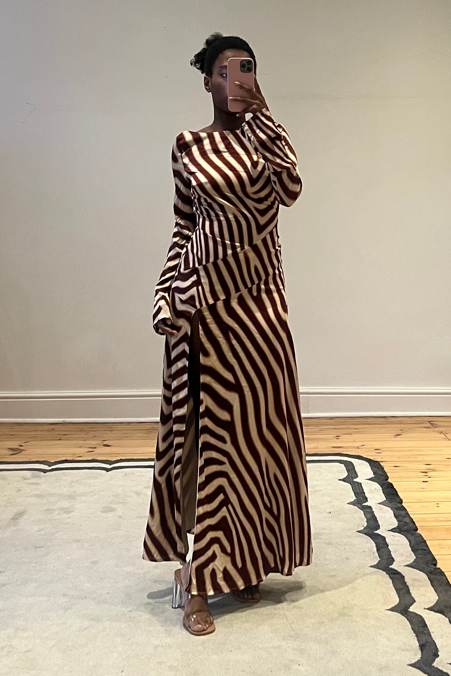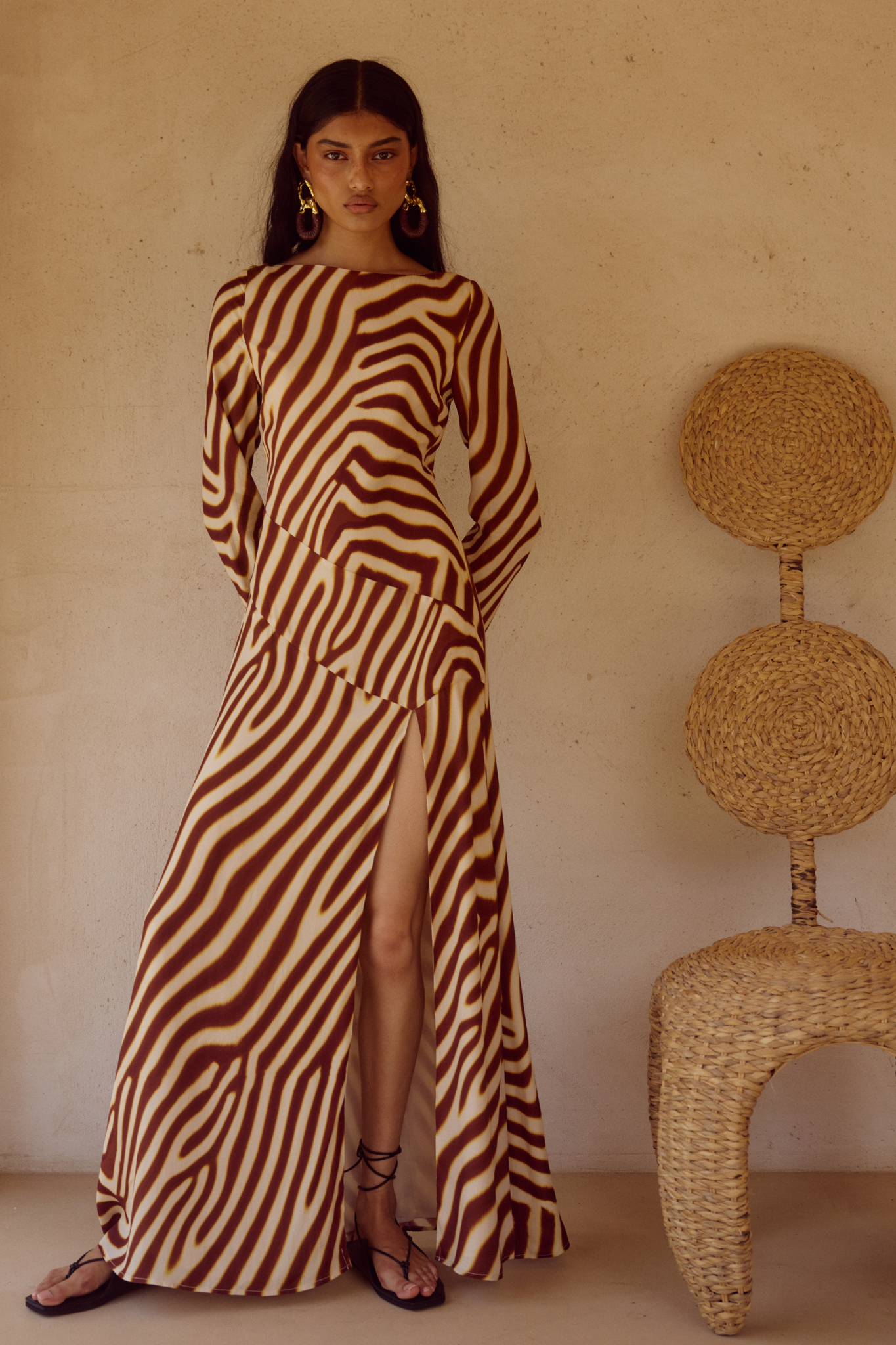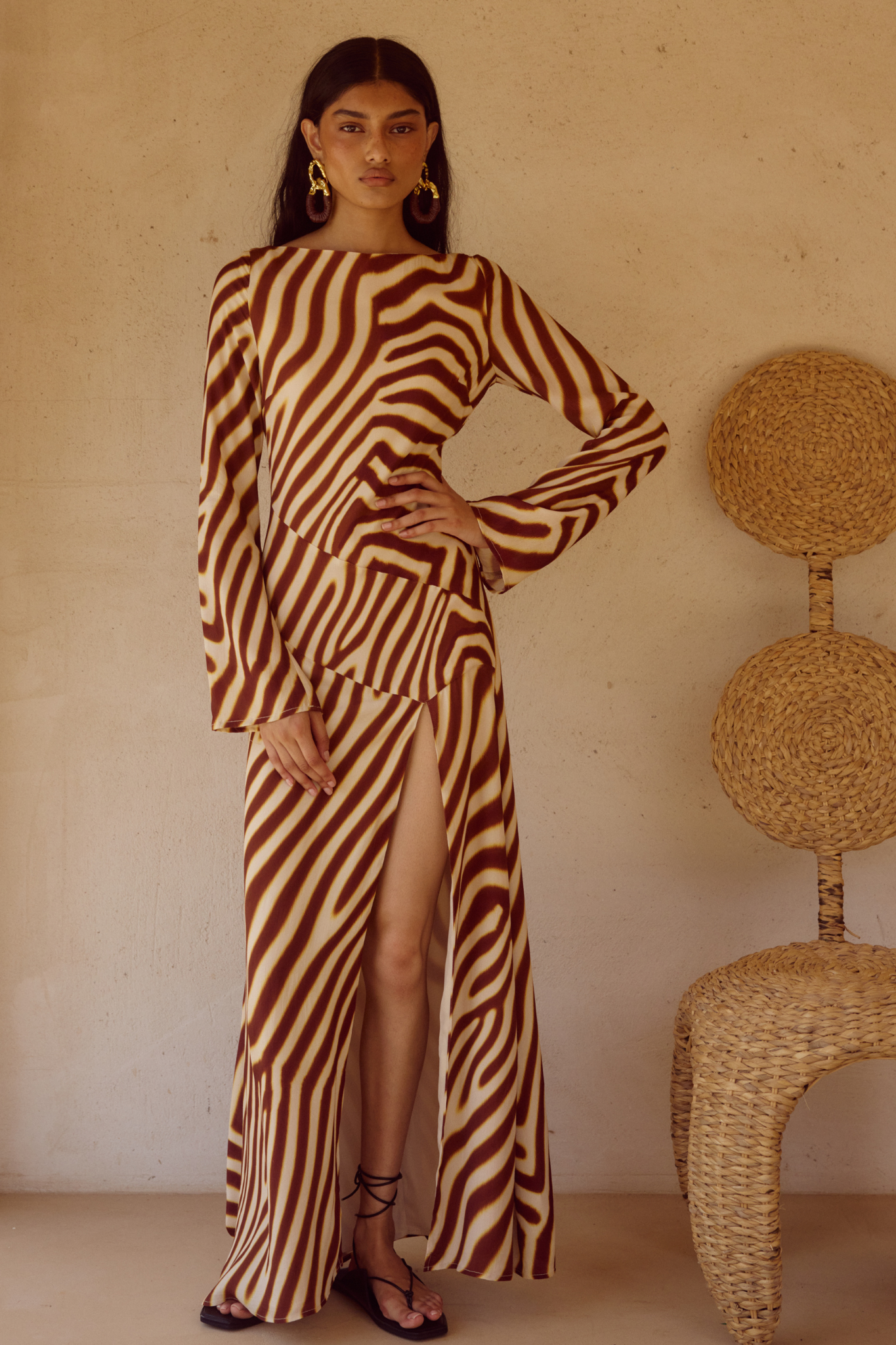 The Montie Sleeved Maxi Dress by Runaway The Label is refined minimalism with a bold edge, delivered in a rich Montie Choc shade. With its one-sleeve design and sleek silhouette, this dress is made for evenings that call for clean lines and confident styling.