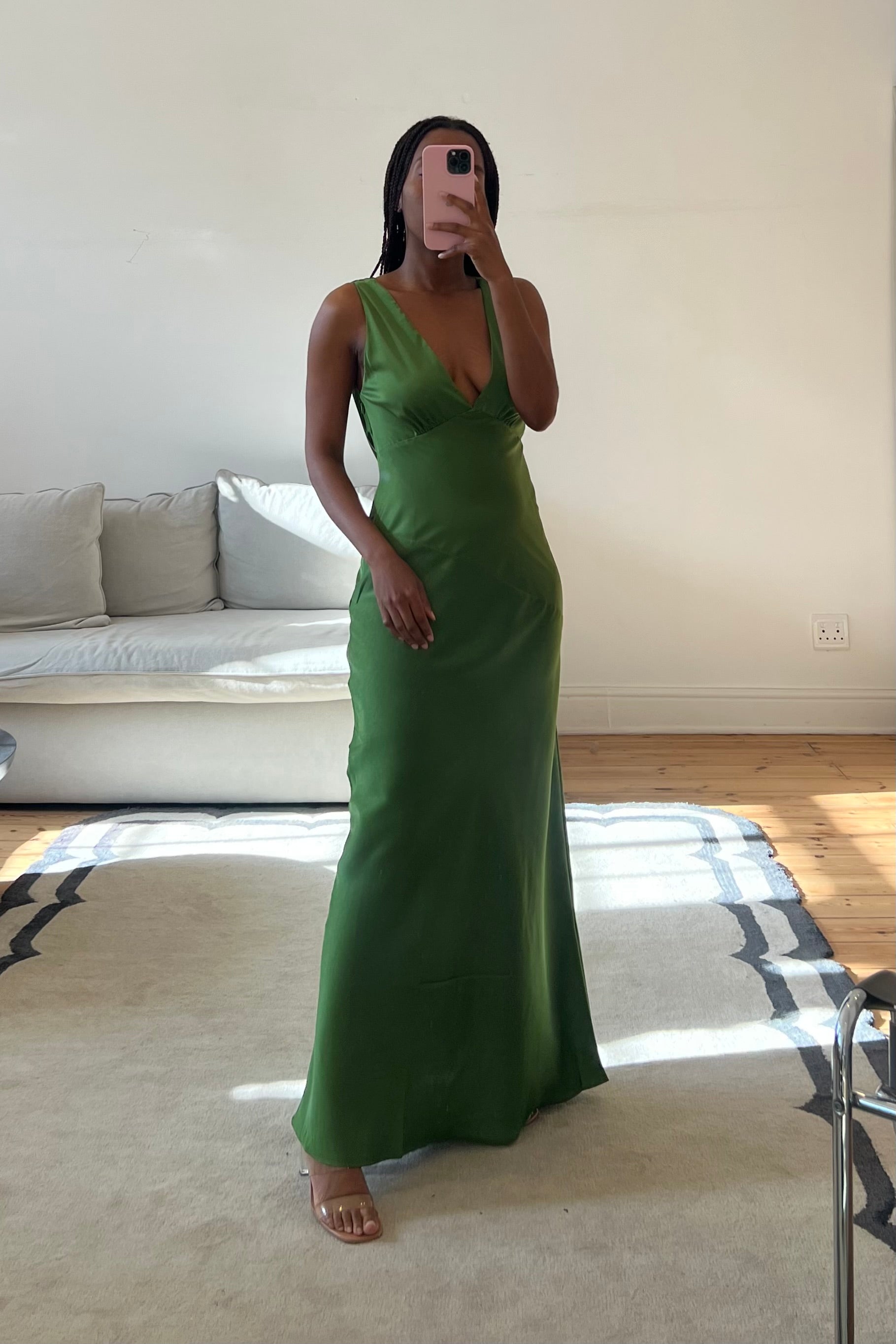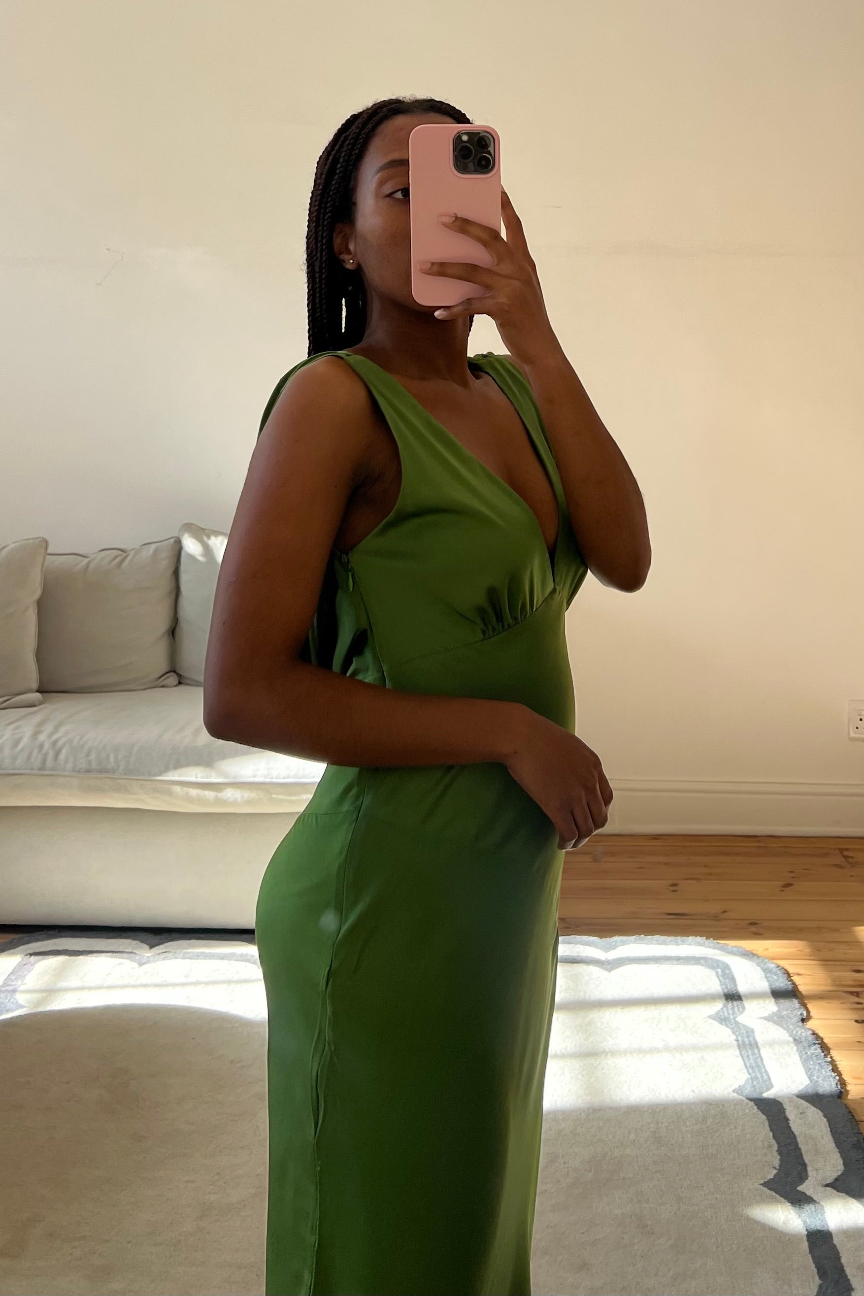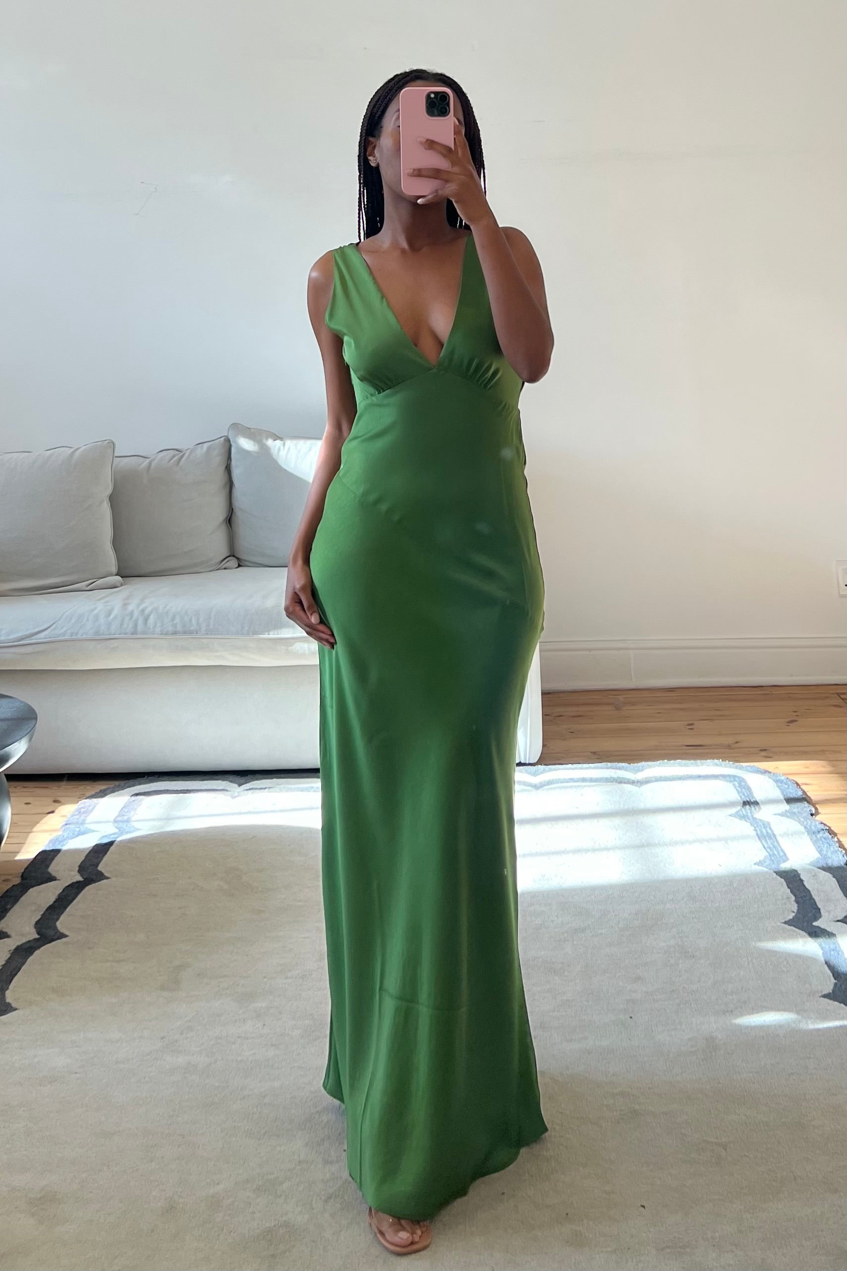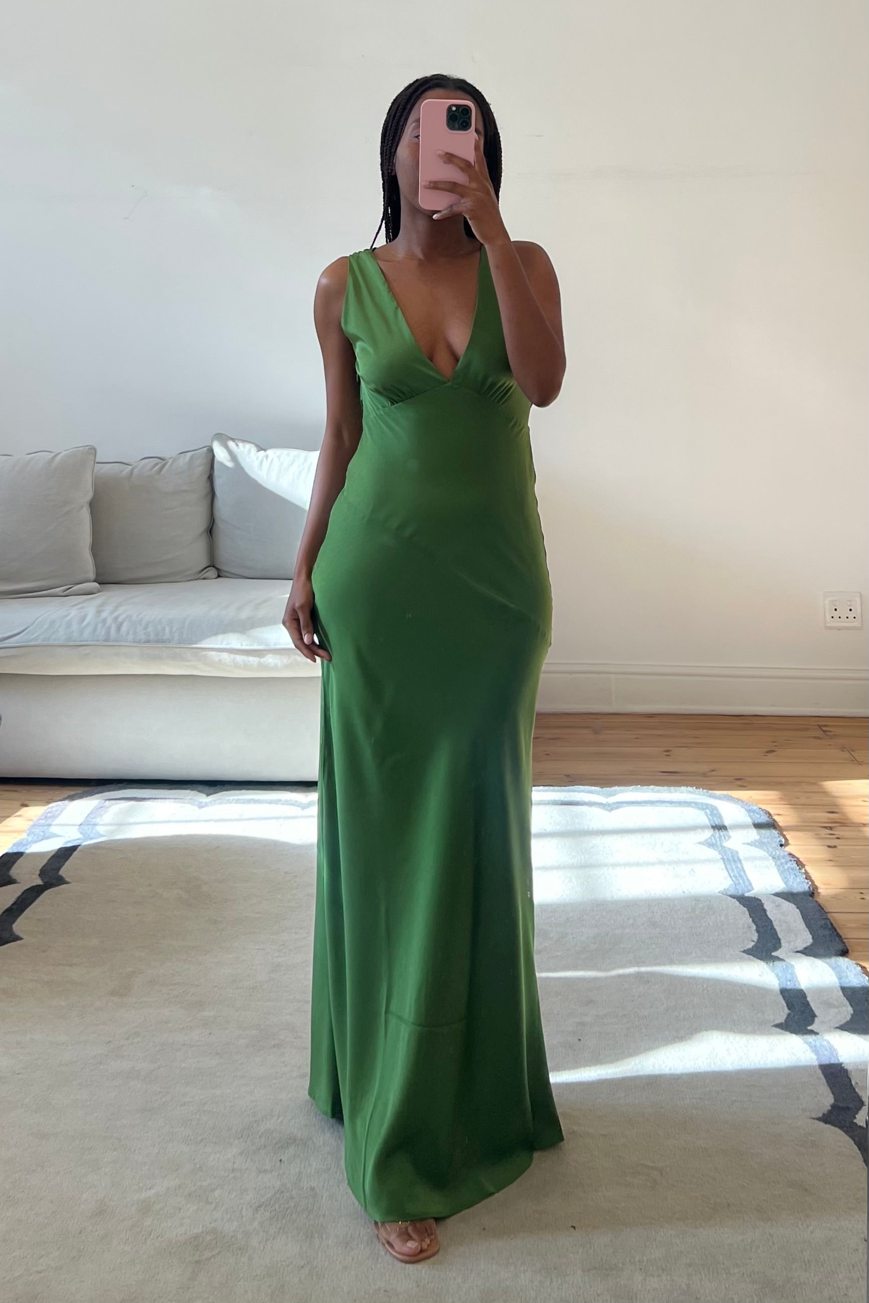 The Nadia Dress by Meshki is a green satin plunge maxi is a vision of modern elegance. With its rich emerald hue and fluid drape, this dress is the ultimate plus-one for weddings, formal events, or garden soirées where understated glamour is key.