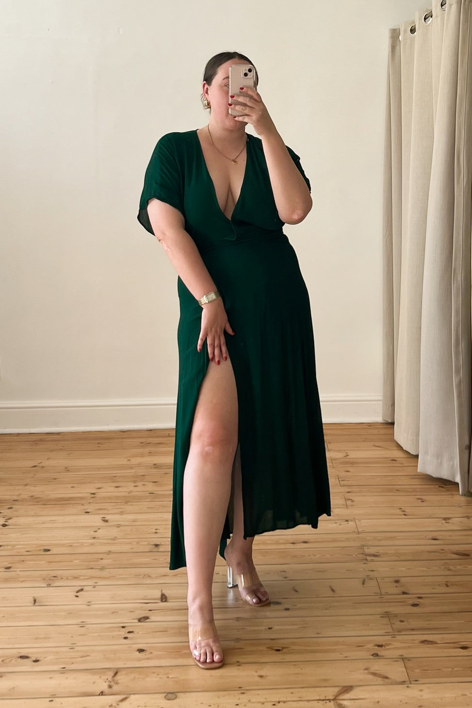 There’s a reason our love affair with Reformation is eternal, their dresses fit like this. The Natasha Dress features a classic wrap silhouette, breezy kimono sleeves, and comes in Reformation’s best-selling deep forest green.