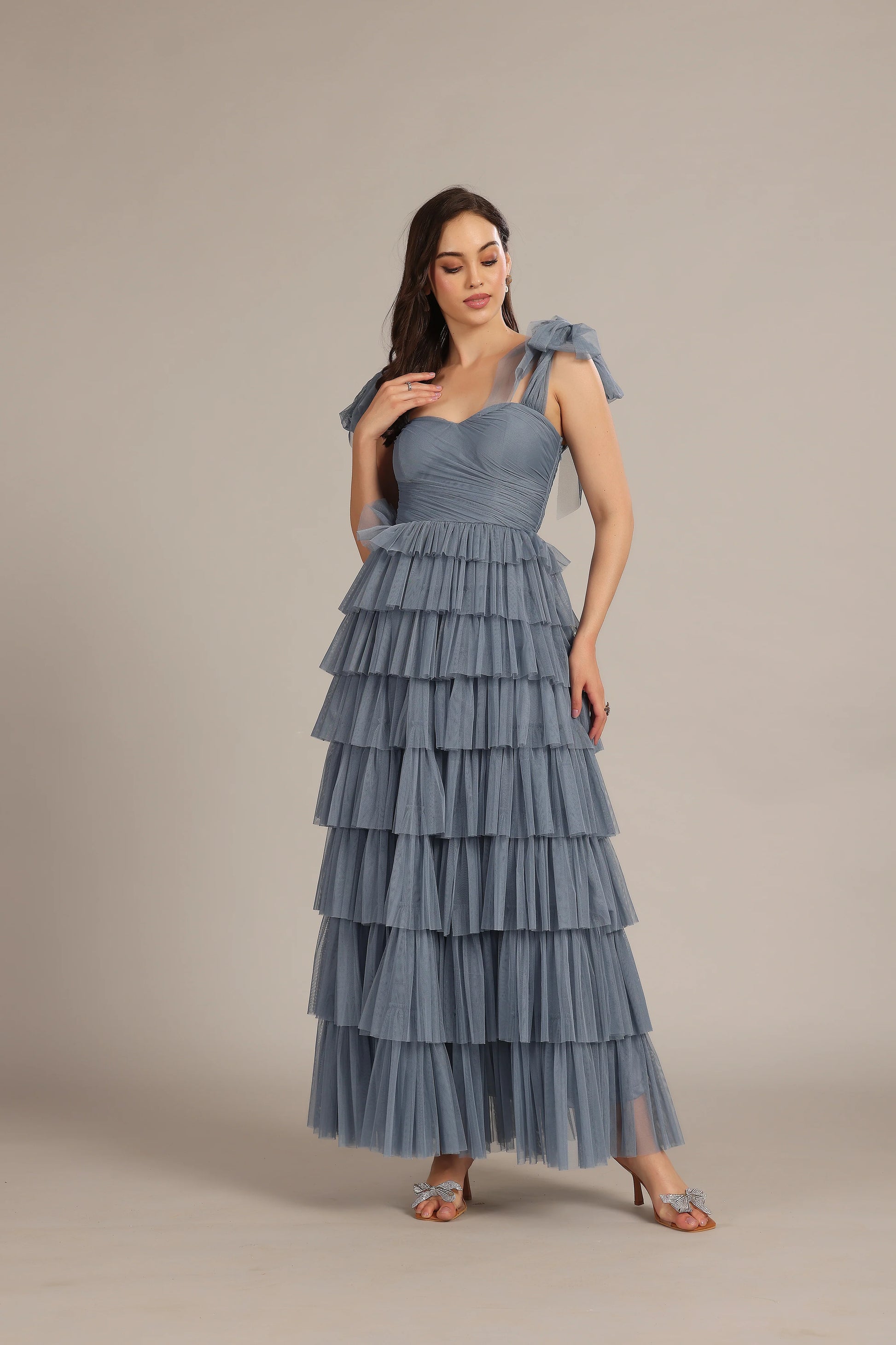 The Ophelia Maxi Dress in Dusty Blue by Lace & Beads is an elegant expression of modern romance rendered in a soft, sophisticated blue hue. This gown features a beautifully layered tulle skirt, delicate tie-shoulder details, and a silhouette that commands attention while maintaining a graceful flow, perfect for weddings, galas, or elevated evening affairs.