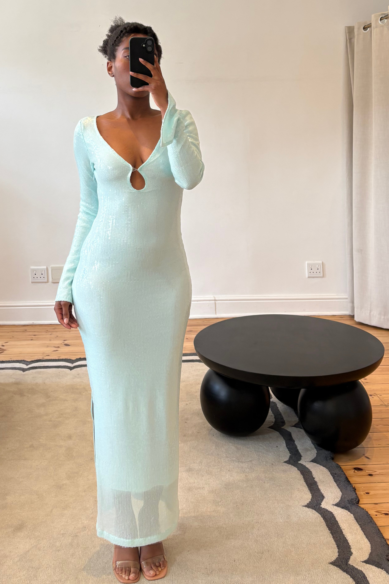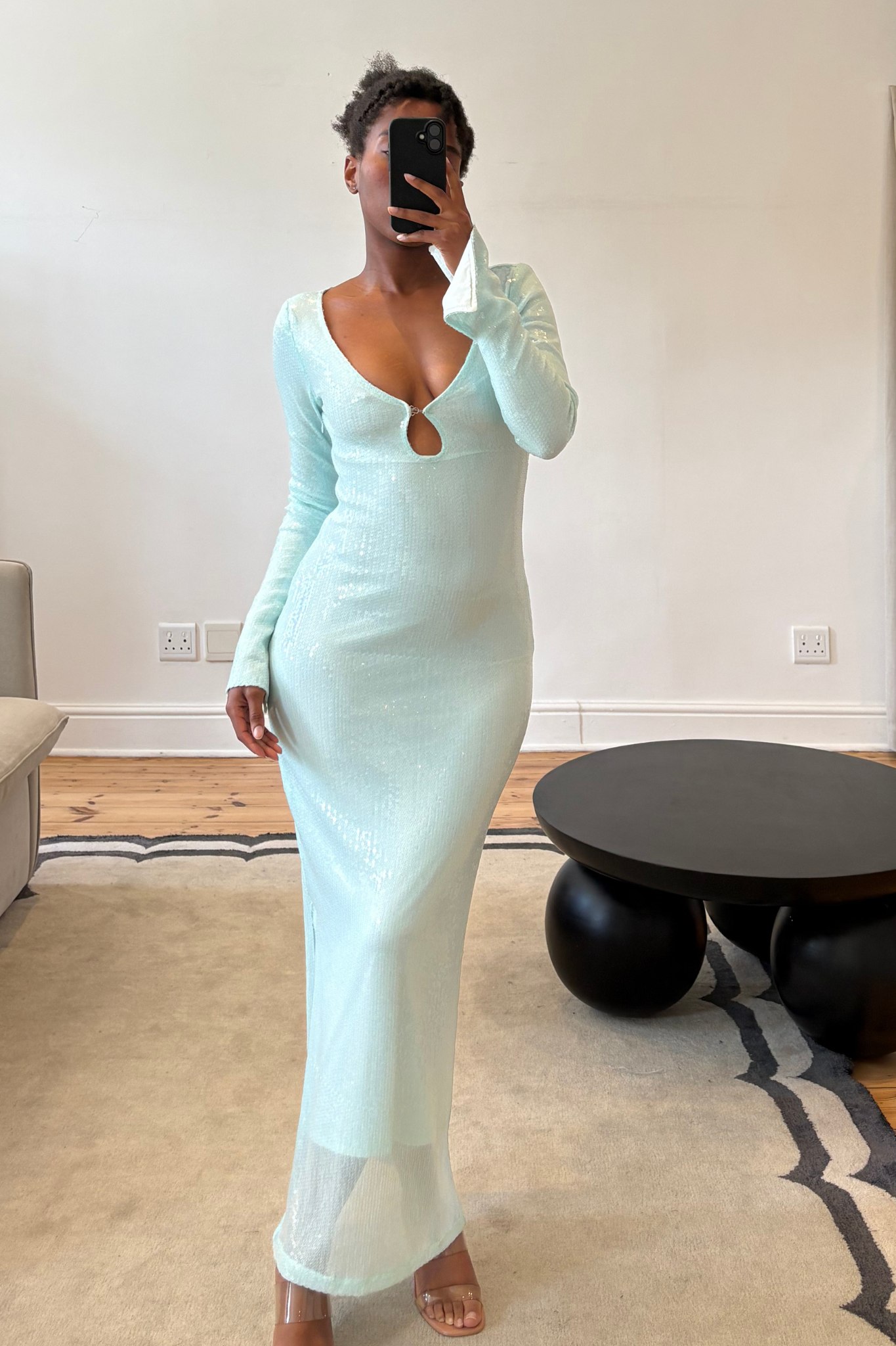 The Bieber Dress by Twin Archives is a striking floor-length gown that merges sleek sophistication with bold glamour. Inspired by Hailey Bieber's iconic style, this figure-hugging maxi features a sultry keyhole neckline, long sleeves, and all-over blue sequin detailing that catches the light with every move. Perfect for evening soirées, red carpet moments, or any event where you want to be unforgettable.